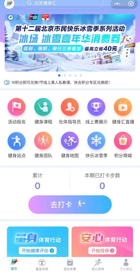 市民只需要登录“北京健身汇”小程序,在“报名参赛”栏中点击进入“爱尚冰雪·北京冰雪大联动”,选择报名即可购买冰雪护照。此外,近日新发放了一批北京市民快乐冰雪季“冰场、冰雪嘉年华消费券”,市民也可进入“北京健身汇”小程序领取使用。